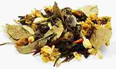 Składniki: zielone herbaty: Sweet Flower, Yunnan Green, Formosa Gunpowder, Phoenix Eyes, biała herbata Snow Buds, kwiatki osmantusa, jaśminu, chryzantemy, liście kari (=curry leaf= Murraya koenigii), kardamon, kawałki drzewa sandałowego, kurkuma, aromat.