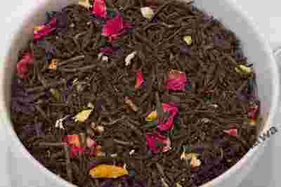 Czarna herbata liściasta z dodatkiem imbiru, wanilii, cynamonu, pomarańczy, płatów róży oraz aromatu.