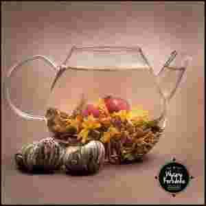 Właściwy sposób parzenia herbat kwitnących jest dość istotny, ponieważ dzięki temu możemy cieszyć się widokiem niezwykłego dzieła. Do szklanego dzbanka należy włożyć herbacianą kulę, zalać odpowiednią ilością wody (polecam ok. 800ml) najlepiej o temperaturze 85°C i zaparzać ok. 4-5 minut.