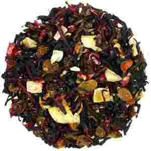 Susz owocowo-kwiatowy na bazie hibiskusa, nie zawierający liści herbaty, składający się ze skórki róży, rodzynek, owoców kandyzowanych oraz suszonych kawałków banana.