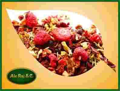 Bezkofeinowy susz owocowy z dodatkiem jabłka, dzikiej róży, truskawki, maliny, aronii, jagody, hibiskusa, głogu, trawy cytrynowej, czarnego bzu, tarniny, jarzębiny, płatków kwiatów słonecznika o słodkim a zarazem orzeźwiającym aromacie owocowym.
