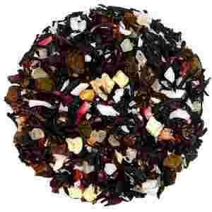 Susz owocowo-kwiatowy na bazie hibiskusa, nie zawierający liści herbaty, składający się ze skórki róży, rodzynek, kokosa, jabłka i ananasa.