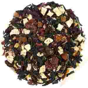 Herbata owocowa na bazie hibiskusa z dodatkiem skórki róży, suszonych owoców malin i aronii, liści malin, rodzynek oraz suszonych kawałków jabłek