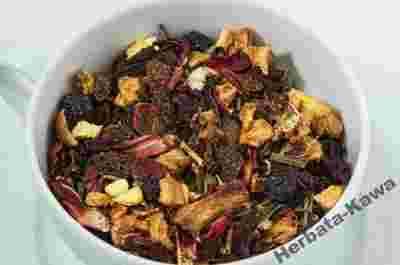 Mieszanka owocowa, w której skład wchodzą: porzeczki, jabłko, aronia, skórka pomarańczy, kwiat hibiskusa, trawa cytrynowa, cytrusowo-alkoholowy aromat.