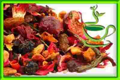 - Hibiskus, Jabłko, Tarnina, Aronia, Śliwka, Malina, Czarny bez, Wiśnia, Skórka pomarańczy, Ananas, Rodzynki, Zielona herbata Bancha, Wiśnia,płatki słonecznika i ślazu, Nuta aromatu bananowego z odrobiną brandy.