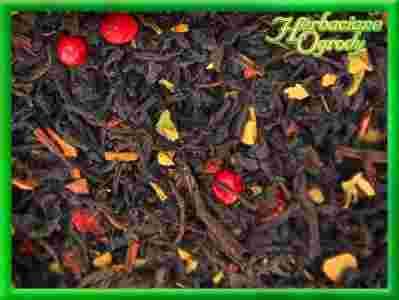 Czarna herbata liściasta z dodatkiem liści truskawki i ziaren pieprzu czerwonego. Aromatyzowana.