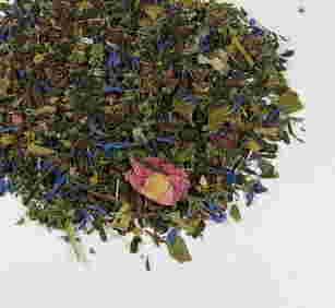Herbata Pu-Erh (5-7 lat), kawałki guarany, ginkgo, kawałki czerwonej i czarnej porzeczki, liście maliny i jeżyny, kwiatki piwonii i bławatka, aromat.