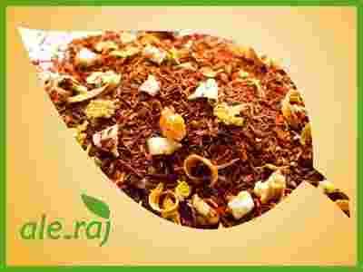 Unikalna kompozycja herbaty Rooibos z białą czekoladą, kwiatem pomarańczy, płatkami słonecznika, pomarańczą kandyzowaną o czekoladowo - cytrusowym aromacie.