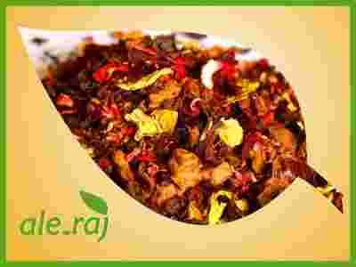 Afrykański rarytas - wyśmienita kompozycja bezteinowej herbaty Rooibos z hibiskusem, żółtymi płatkami słonecznika, skórką dzikiej róży, suszonymi kawałkami jabłek i malin o aromacie owocowym z tropikalną nutą. Duża ilość hibiskusa i dzikiej róży wzbogaca naszą mieszankę o witaminę C, która jest polecana w okresie jesienno - zimowym, oraz w trakcie zmian pór roku kiedy łatwo o przeziębienia. Polecam!
