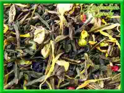 Zielona Herbata Sencha z niewielką domieszką herbaty Chun-Mee z dodatkiem: jabłka, maliny i moreli. Całość dopełniają płatki kwiatu nagietka, przyprawione delikatnym, cytrusowym aromatem.