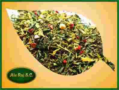 zielona herbata Sencha i Chun Mee z dodatkiem nagietka, brzoskwini, jabłka, maliny o wykwintnym cytrusowym aromacie.