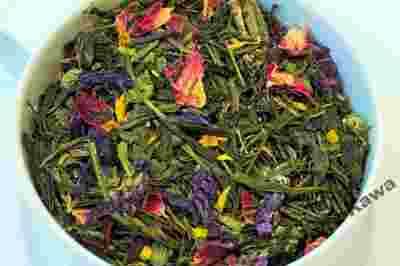 Zielona herbata Sencha z dodatkiem płatków róży, malwy i słonecznika oraz aromatu mango i bergamotki.