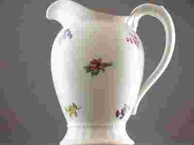 Obiekt wykonany z najwyższej jakości,imponująco białej porcelany,zdobiony rzucikami kwiatuszków.Podstawa kanelowana z delikatnym wzorkiem perełkowym,uszko bardzo ładnie wymodelowane co nadaje mlecznikowi niezwykłego uroku.Całość podkreślono złoceniem.Uwagę zwraca fason.Mlecznik prezentuje się bardzo ładnie.Perełka dla miłośników śląskiej porcelany,interesujący przedmiot do postawienia w witrynce lub w kredensie w celach dekoracyjnych*