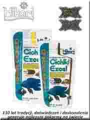 Cichlid Excel- Podstawowy pokarm dla wszystkichroślinożernych pielęgnic- głównie pyszczaków z jezior Tanganika i Malawi. Może być również podawany innym rybom roślinożernym. Głównym składnikiem są kiełki pszenicy, lucerny, soi i słonecznika oraz spirulina. Granulki pływają po powierzchni wody, po nasiąknięciu wodą stają się sprężyste i przez to chętnie pobierane przez ryby. WersjaMini to granulki o śr. 0,1-0,2cm dla mniejszych ryb.