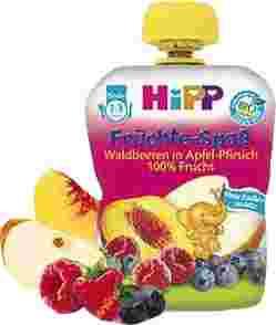 Hipp Fruchte Spass Waldbeeren in Apfel - Pfirsich 90 gr - Owocowy mus Owoce leśne, Jabłko i Brzoskwinia. Przepyszny deserek dla każdego malucha.Produkt przeznaczony do bezpośredniego spożycia. Waga 90 g, od 1 roku życia.