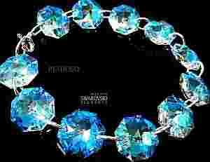 Kryształowe oktagony w przepięknym kolorze: Blue Aurora (niebieski tęczowy opalizujący). Kryształy pięknie mienią się na świetle. Zależnie od tła przybierają różnych barw. Na ciemnym są niebiesko-błękitne, na jasnym subtelnie pomarańczowe.