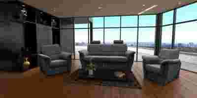 W skład zestawy wchodzi kanapa trzyosobowa, która posiada regulowane zagłówki oraz dwa fotele.