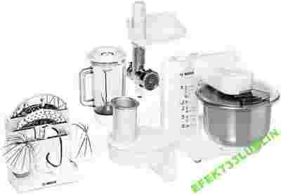ProfiMixx electronic, Robot kuchenny, 600 W, multi-motion-drive: innowacyjny, wielokierunkowy ruch planetarny zabieraków, 4-stopniowa regulacja prędkości, funkcja pracy pulsacyjnej, wielofunkcyjne ramię ze specjalną przekładnią, maszynka do mielenia mięsa, rozdrabniacz, mikser z tworzywa sztucznego o poj. 0,75l, tarcze ze stali szlachetnej: dwustronna do krojenia na plasterki, dwustronna tnąca na wiórki, tarcza do drobnego tarcia, misa ze stali szlachetnej z przykrywką (poj. max. 2,7 kg), końcówki: do mieszania ciasta, ubijania piany, hak do zagniatania ciasta, pojemnik do przechowywania końcówek i tarcz, interaktywna płyta DVD z przepisami kulinarnymi, zintegrowany schowek na kabel, kolor: biały