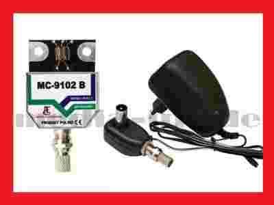 Wzmacniacz antenowy MC-9102B/CERAMIC służy do wzmacniania słabych sygnałów TV naziemnej. Wzmacniacz MC-9102B/CERAMIC jest przeznaczony do montowania bezpośrednio na zaciskach anteny (siatkowej) w puszce antenowej. Takie rozwiązanie zapewnia wzmocnienie słabych sygnałów już na wejściu anteny co jest szczególnie istotne przy niskim stosunku sygnału do szumów. Ekranowanie wzmacniacza w odlewie ze znolu znacznie ogranicza wrażliwość na zakłócenia CB, GSM, FM itp. zakłucenia elektromagnetytczne.