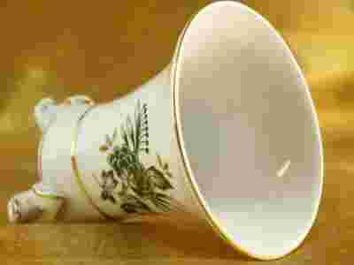 Wazonik wykonany został z najwyższej jakości,imponująco białej porcelany,zdobiony efektownym motywem dekoracyjnym w postaci kwiatu w przepięknej kolorystyce(dekoracja obustronna). Przy podstawie przebiega subtelny,koszyczkowy relief.Rozłożystą ku wylewowi formę wsparto na pięknie wymodelowanych,trzech nóżkach.Kontur porcelany wzbogacono złotem.
