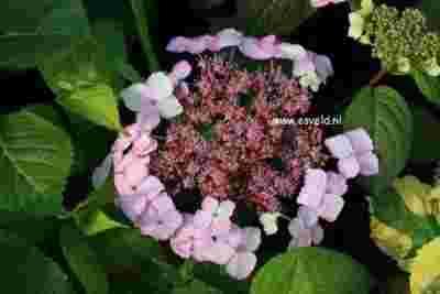 Pochodzi Zwarty krzewy o półkulistym pokroju dorastający do około 1-1,2 m wysokości. Pędy drobne, słabo rozgałęzione. Liście eliptyczne, zaostrzone, piłkowane, ciemnozielone z delikatnym zaczerwienieniem. Wierzchołek i brzegi liści podgięte do dołu. W lipcu pojawiają się nieduże, baldaszkowate kwiatostany o średnicy około 8 cm, zbudowane z 2 rodzajów kwiatów: zebranych centralnie drobnych, różowych lub niebieskich kwiatów płodnych oraz znacznie większych, położonych na brzegach kwiatostanu białych kwiatów płonnych. Kwiaty pojawiają się na pędach dwuletnich i jednorocznych.