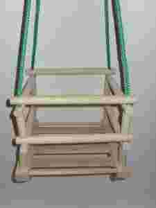 Drewnianą huśtawkę z kwadratowym siedziskiem.