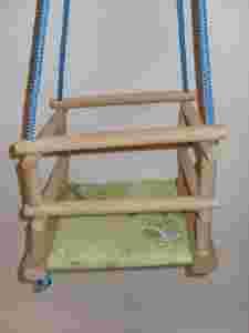 Drewnianą huśtawkę z kwadratowym siedziskiem.