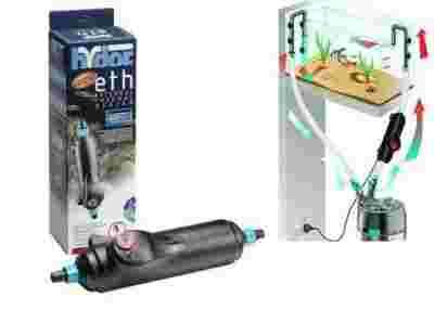 Hydor ETH grzałka z termostatem, która pracuje poza akwarium, mocowana na wężu przepływowym filtra zewnętrznego o średnicy 16mm. Łatwa do podłączenia do każdego typu filtra zewnętrznego. Może być ustawiona pod dowolnym kątem pod warunkiem, że jest zainstalowana zgodnie z kierunkiem przepływu wody, wskazanym strzałką na obudowie grzałki. Nie zakłóca swoją obecnością harmonijnie urządzonego akwarium. Posiadają szeroki zakres regulacji temperatury od 18°C do 34°C. Ustawioną temperaturę utrzymuje samodzielnie bardzo precyzyjny termostat. Posiada wskaźnik kontroli temperatury oraz działania grzałki. Mogą być używane w akwariach