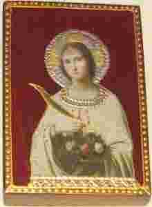 Postać świętej trzyma w jednej ręce kwiaty, a drugiej palmę - symbol męczeństwa.