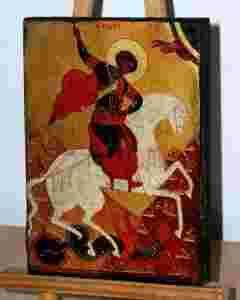 Przedstawienie Św. Jerzego podczas sceny walki se smokiem - Św. Jerzy zabija smoka, który uosabia wszelkie zło. Oryginał ikony pochodzi z końca XIV w.