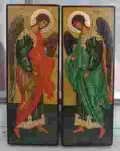 IKONKI WYKONANE NA DESCE SOSNOWEJ,POKRYTE ZŁOCENIAMI I WERNIKSEM POSTARZAJĄCYM,ZABEZPIECZONE SZELAKIEM.