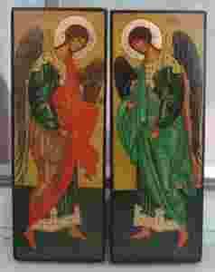 IKONKI WYKONANE NA DESCE SOSNOWEJ,POKRYTE ZŁOCENIAMI I WERNIKSEM POSTARZAJĄCYM,ZABEZPIECZONE SZELAKIEM.