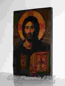 Oryginał ikony pochodzi z VI w. Jeden z bardziej znanych wizerunków Chrystusa Pantokratora. Pantokrator oznacza Wszechwładca. Chrystus przedstawiony jest z pięknie zdobionym ewangeliarzem w lewej dłoni i uniesioną prawą dłonią w geście błogosławieństwa. Połączone trzy palce oznaczają Trójcę Św. , a uniesione palce - wskazujący i środkowy są symbolem Boga i człowieka. Piękne, uduchowione, a zarazem majestatyczne przedstawienie Chrystusa.