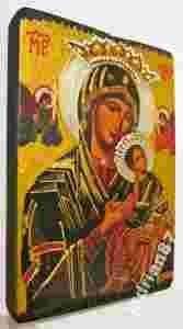 malowanie, transfer, 3 rodzaje złoceń, na drewnianej deseczce z delikatnymi rzeźbieniami na górze i na dole ikonki,
