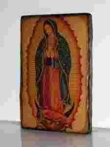 Ikona wykonana na bazie wzoru - cudownego obrazu na płótnie z agawy powstałego w ostatnim dniu objawień maryjnych na wzgórzu Tepeyac.