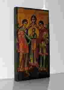 Wszystkie nasze ikony stylizowane są na stare, na ogół pokryte złoceniami i spękaliną. Deski często zostają "surowe", a politury lub podkłady celowo nierówne, aby stwarzały wrażenie starości. Do wykonania ikon użyto wysokiej jakości farb, werniksów, wosków, pokostów i złoceń. Technika wykonania: transfer-malowanie-złocenia-postarzenia (transfer - odbitka farby z szablonu, malowanie po transferze, złocenia farbami lub płatkami złota lub szlagmetalem, stylizowanie ikony na starą). Na życzenie mogę dosłać e-mailem zbliżenia fragmentów i tyłów poszczególnych ikon.