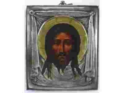 Doskonały prezent na Komunię świętą. Współczesna Ikonka w srebrnej koszulce z przedstawieniem twarzy Chrystusa - określanym jako "Chusta św. Weroniki", wymiary: 110 x 94. ZAPRASZAMYdonaszejgaleriiGoogle,sątamdodatkowefotografiewystawianychprzedmiotów