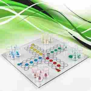 - skład zestawu: szklana plansza o wymiarach 31 x 31 cm, 16 małych kieliszków imitujących pionki, 2 kości do gry