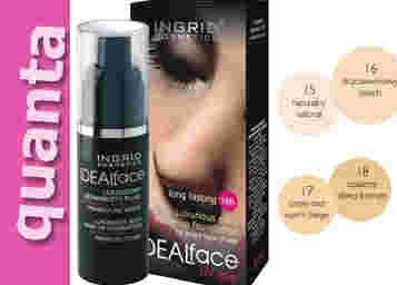 Ingrid, Ideal Face Fluid. Niezwykle delikatny, luksusowy fluid, który doskonale nawilża i wygładza skórę. Dzięki lekkiej konsystencji doskonale się rozprowadza, a pompka ułatwia aplikację fluidu. Kosmetyk wyrównuje koloryt cery pokrywając drobne niedoskonałości. Jest długotrwały, utrzymuje się nawet do 16h i przez cały dzień utrzymuje odpowienią wilgotność naskórka, dzięki czemu Twój makijaż wygląda świeżo przez wiele godzin. Innowacyjne kosmetyczne mikrosfery absorbują nadmierną ilość sebum, pozostawiając skóręaksamitnie matową. Mikronizowane pigmenty zapewniają doskonałe krycie oraz idealne dopasowanie do koloru skóry.