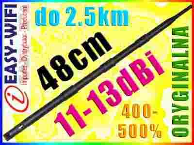 Dookólna 11~13dBi 2.4GHz 48cm dookólna antena pokojowa (wewnętrzna). Idealnie nadaje sie do zwiększenia zasięgu domowej sieci można ja stosować zarówno do kart radiowych jak i AP, posiada złącze rp-sma lub rp-tnc (na innych aukcjach oferujemy odpowiednią przejściówkę) pozwala na uzyskanie 400-500% większego zasięgu/siły sygnału w porównaniu ze standardową 2-3 dBi anteną montowaną seryjnie w AP, routerach, kartach PCI oraz USB- idealna w przypadku trudności z uzyskaniem stabilnego polaczenia.