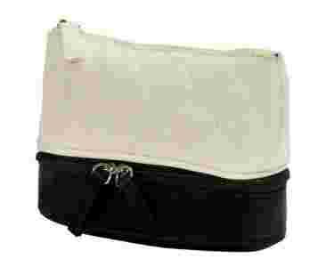 Śliczna, mała damska kosmetyczka zapinana na zameczki. Posiada dwie komory: górna, biała wykonana z zamszu, zapinana na zamek oraz dolna otwierana jak walizka, lekko usztywniona, zapinana na dwa zameczki. Obydwie komory wyścielane są czarnym materiałem. Kosmetyczka bardzo elegancka, pięknie się prezentuje, pojemna. Wymiary: ok. 14,8x8; wysokość ok. 11cm.