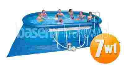Prezentowany zestaw 7w1 wyprodukowany przez INTEX zawiera w sobie akcesoria, które zadbają o odpowiednie warunki do odpoczynku w wodzie. Basen stelażowy jest solidny, dzięki wytrzymałemu, trójwarstwowemu PVC jakie zastosowano podczas jego produkcji. Jego wymiary spokojnie pomieszczą kilka osób. Pewnie zastanawiasz się, jak skomplikowany musi być montaż tak dużego zbiornika. Zapewniamy, że z instrukcją dołączoną na płycie DVD nie poświęcisz na to więcej niż 30 minut.