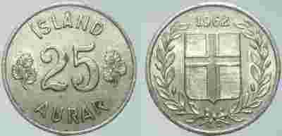 ISLANDIA - 25 AURAR 1962 r moneta nr 1.