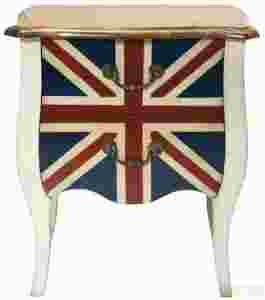 Ta oryginalna komoda będzie prawdziwą ozdobą wnętrza. Piękna, mała komódka z wizerunkiem angielskiej flagi oczaruje każdego miłośnika Wielkiej Brytanii. Dwie przestronne szuflady posiadają stylizowane uchwyty miedziane. Delikatnie zakrzywione nogi i atrakcyjnie wykończone drewno topoli podkreśla wyjątkowy charakter komody. materiał: lite drewno - topola, uchwyt: miedź