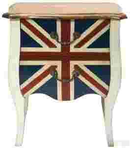 Ta oryginalna komoda będzie prawdziwą ozdobą wnętrza. Piękna, mała komódka z wizerunkiem angielskiej flagi oczaruje każdego miłośnika Wielkiej Brytanii. Dwie przestronne szuflady posiadają stylizowane uchwyty miedziane. Delikatnie zakrzywione nogi i atrakcyjnie wykończone drewno topoli podkreśla wyjątkowy charakter komody. materiał: lite drewno - topola, uchwyt: miedź