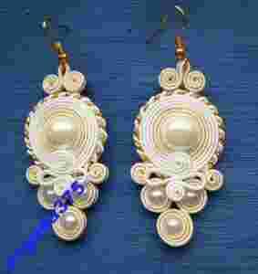 Do wykonania kolczyków użyto między innymi:sutasz czeskiej firmy Pega w kolorach: biały,ecru, ciut złotego w żmijce oraz perły duże seashelle .