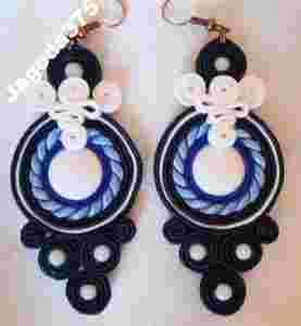 Do wykonania kolczyków użyto między innymi:sutasz czeskiej firmy Pega w kolorach granat,biały i niebieski oraz biała masa perłowa.