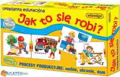 W zestawie znajduje się 15 plakietek z rysunkami 3 cykli produkcyjnych. Aby ułożyć pięć plakietek w proces produkcyjny, trzeba najpierw zadać trochę pytań dorosłym. Sprawdzisz sam, czy ułożyłeś właściwie, dzięki barwnym znakom na bokach plakietek. Powodzenia.