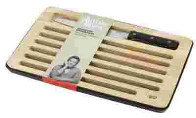 Zestaw do krojenia pieczywa Jamie Oliver składa się z deski z rowkami oraz noża do krojenia chleba. Masywna i wytrzymała deska z drewna dębowego posiada wgłębienie do którego bezpiecznie schowamy nóż kiedy zestaw nie będzie w użyciu. Deska posiada podstawkę z tworzywa, do której wpadają okruszki powstałe w trakcie krojenia. Wymiary: deska 25 x 40 cm. Zaleca się mycie ręczne.