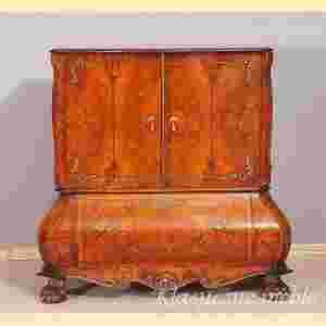 Proponuję Państwu piękny barek. Mebel wykonany współcześnie w stylu neobarokowy, wyjątkowo kunsztownie fornirowany drewnem orzechowym i czeczotą orzechową, oraz zdobiony snycerką.